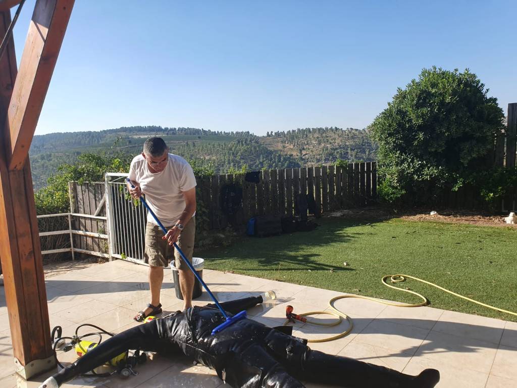 חמש וחצי בבוקר כבר בבית, שוטף ציוד צלילה בחצר באור ראשון כדי לנסות להסיר כל זכר למי הבור.