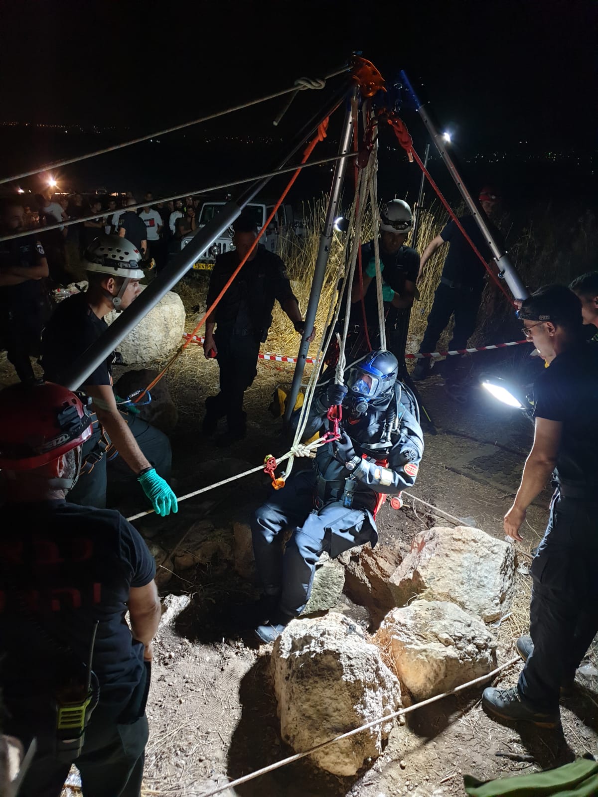 מוכנים, החברה של כב"ה מלבישים אותי במשולש חילוץ אליו תחובר מערכת ההרמה שבעזרתה תתבצע הכניסה והיציאה מהבור. שתי דקות לפני הירידה אמרתי לחיים: "אני עם המסכה בלי קשר, יהיה קשה מאד לשמוע אותי, צריך הדממת אתר". לחיים לא צריך להסביר מעבר לזה, כך היה.